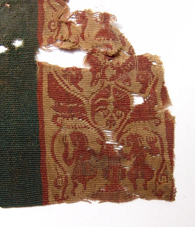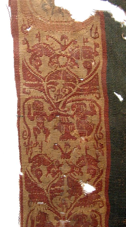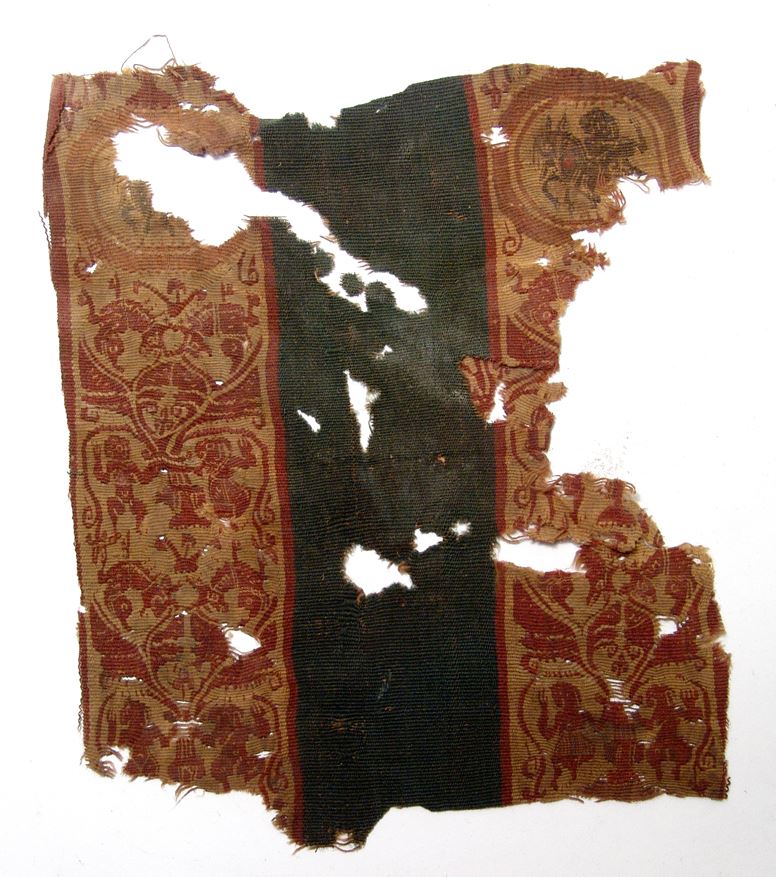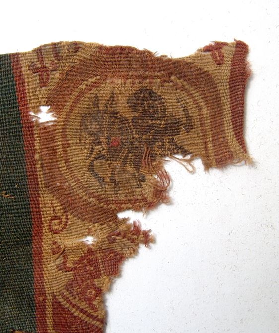 A nice fragment of Coptic Textile from Roman Egypt, c. 5th - 7th Century AD, in linen, with central vertical band of black bordered by red lines, to either side is a vertical column of decoration consisting of people, animals and floral devices in red over a golden yellow ground. In the upper corners are medallions containing a horseman in dark brown. 10 ¼ in x 8 ¼ in (25.8 x 20.8 cm). Ex Nomis Antiquities.
