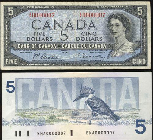 A nice low serial #0000007 matching pair. Includes a 1954 $5 BC-39b and a 1986 $5 Crow-Bouey ENA0000007 BC-56a. Rarely seen! Notes are F and AU+