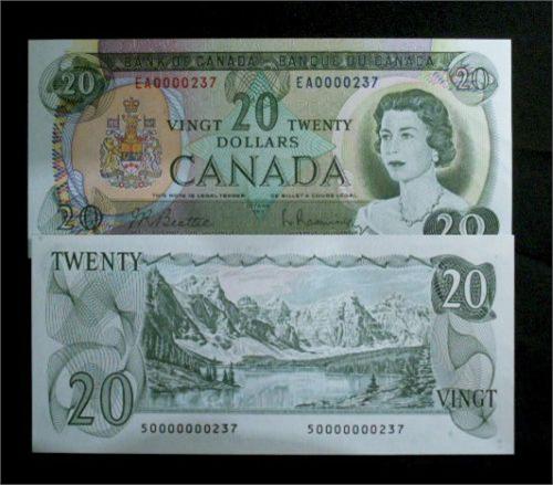A nice matching pair with serial number# 0000237. Includes both 1969 and 1979 $20 bills, BC-50a and BC54a