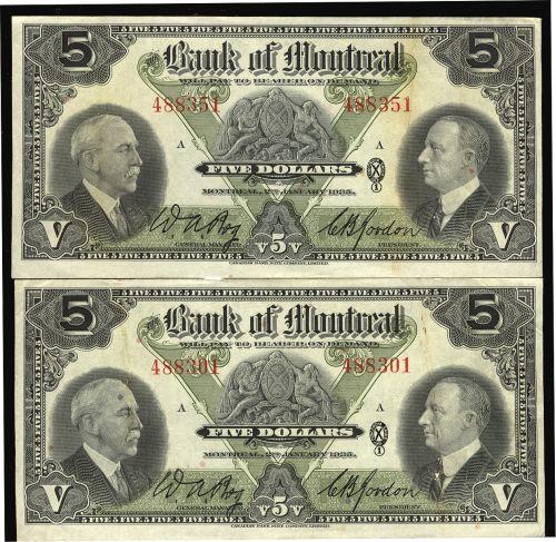 A nice pair of $5 from the Bank of Montreal dated 1935 Serial #488301 and 488351. Both notes are original uncirculated with the usual counting creases. Light yellow stains on reverses but not distracting.