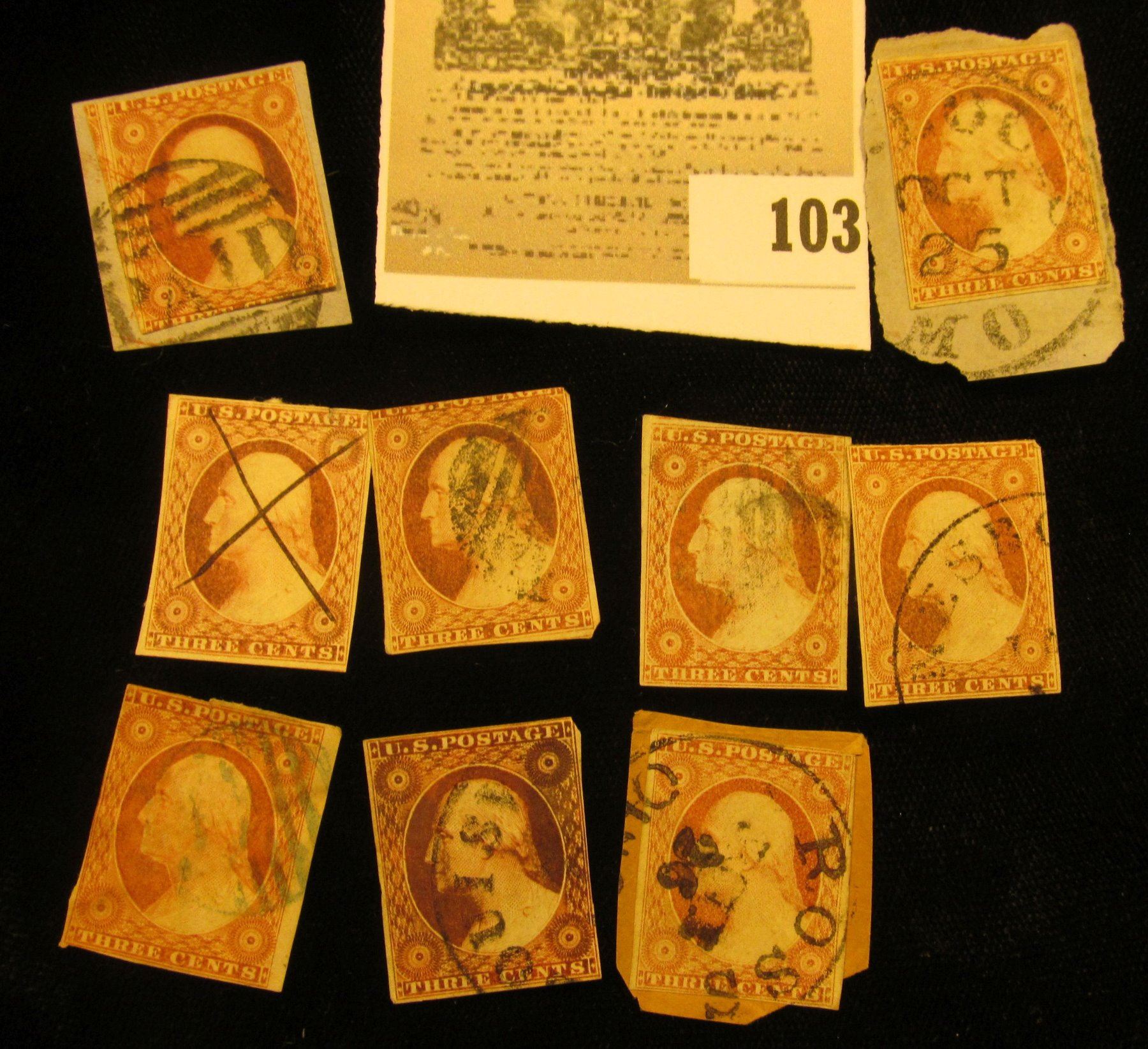 A nice selection of 9 either Scott # 10 or #11, 3c Washington, carmine with various cancels. A nice color study group. Please look at photos to make sure attribution is correct. Not being an expert on these early stamps, I will leave that to you.