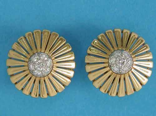 A pair of 18ct gold and diamond earrings, each designed as a stylised circular flowerhead with a...