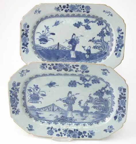 A pair of 18th century Chinese export octagonal dishes, painted with a mother and child in a fenced garden in underglaze blue, 10.75in. £200-250