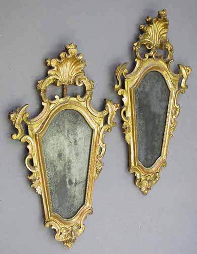 A pair of 18th century design Venetian carved giltwood wall mirrors, with rococo and shell carved pediments, the etched plates 15ins x 8ins £400-600