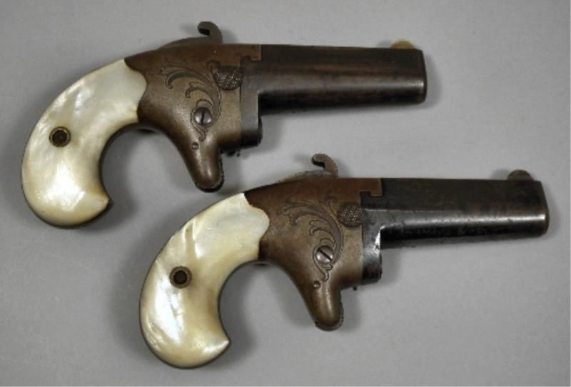 A pair of 19th Century ladies Colt pin fire No 2 pocket pistols with 2.25ins barrels and leaf engraved brass framing and mother of pearl handles, the barrels stamped inColt's PTFA.MFG.Co, Hartford Ct, USAin, with serial Nos 4393 and 4986 to both barr