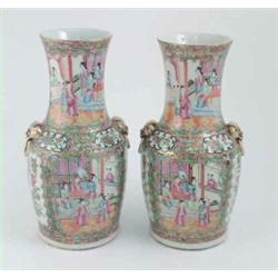 A pair of 19th century Canton baluster vases, with twin gilt handles, painted with figures at various interior pursuits, 14.5ins. £400-600