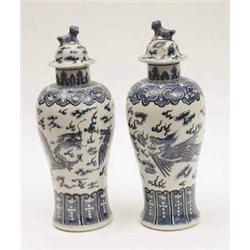 A pair of 19th century Chinese blue and white baluster vases and covers, painted with writhing dragons, 13ins (both a.f.) £100-150