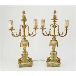A pair of 19th century French neoclassical design 2-branch candelabra, the arms cast with ormolu...