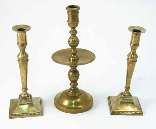 A pair of 19th century Neo-Classical design brass candlesticks, with tapering column stems on square swept bases and another with turned knopped stem and large drip pan, (12 ins), 10 ins £100-150