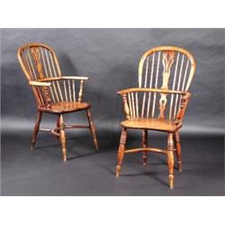 A pair of 19th century beech and elm Windsor armchairs, each with arched spindle turned back with p.