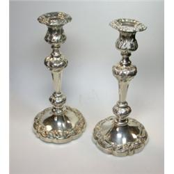 A pair of 19th century electroplate table candlesticks by W Briggs, Sheffield, each raised on a circular lobed base with acanthus knopped conical stem below an acanthus socket, 27cm high £70-100