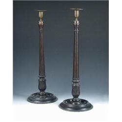 A pair of 19th century stained mahogany candlesticks with gilt brass nozzles and drip pans, the fluted columns flaring to acanthus vases above the turned circular feet, 54cm high (2) £150-200