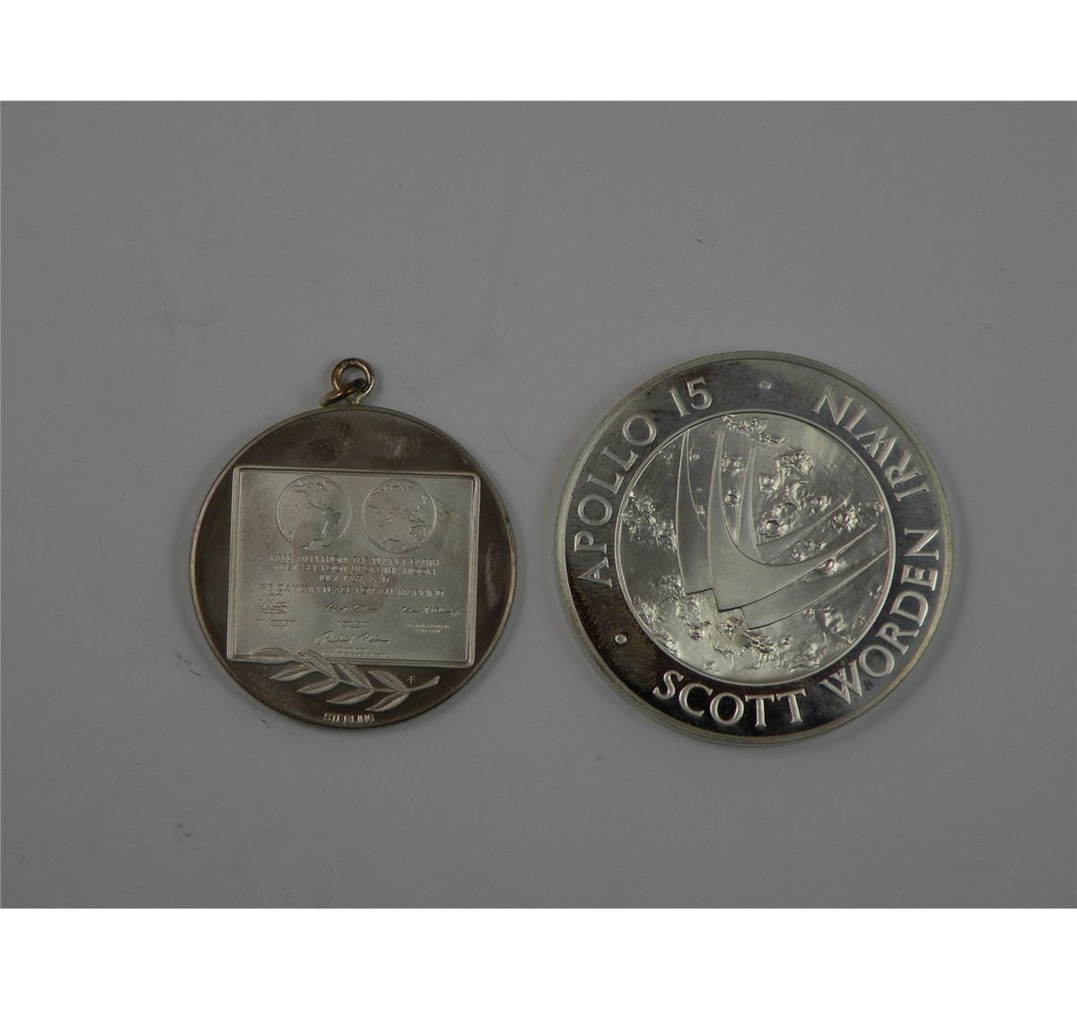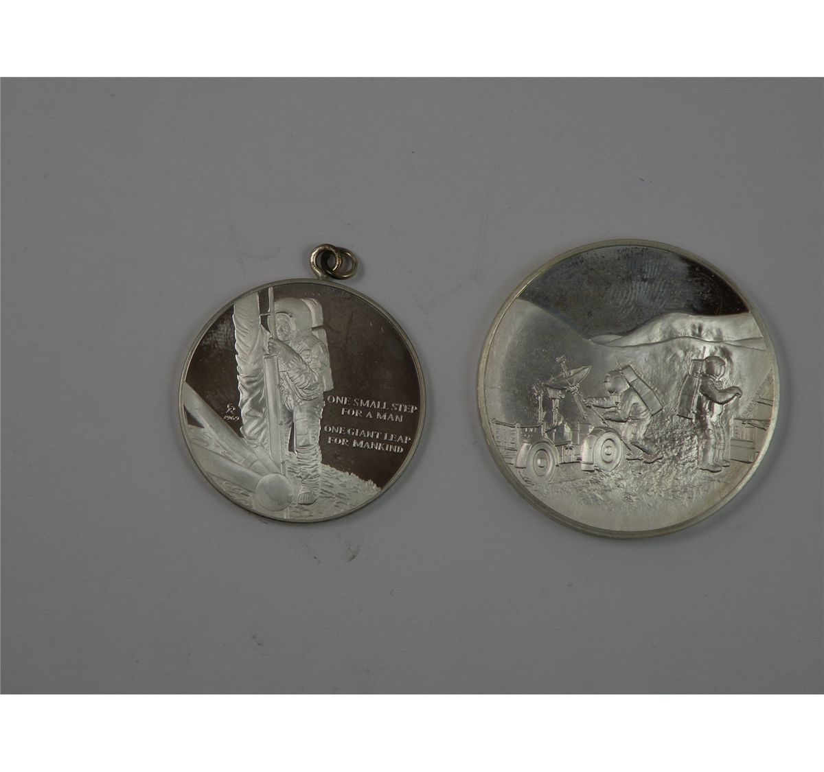 A pair of Apollo program sterling silver medals including a Franklin Mint "First Step on the Moon" medal in its original case. Est.$50