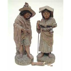 A pair of Austrian terracotta figures of children, the boy modelled slightly stooped with one hand outstretched wearing a hat and tasseled robe, the girl standing with a cone, wearing a hat and corseted dress (arm detached) Boy 24ins tall £200-300