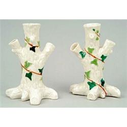 A pair of Belleek Second Period spill vases, modelled as a tree trunk with a spiral band of ivy,...