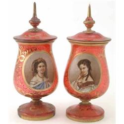 A pair of Bohemian ruby glass vases and covers, each painted with a portrait bust of a young woman, covers with spire finials, one base repaired, 13in. £300-400