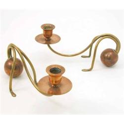 A pair of Carl Deffner Arts and Crafts copper and brass candle stands, the scrolling sconce arm supported on a counterbalanced ball weight and two feet, stamped, 9.75 ins £200-250