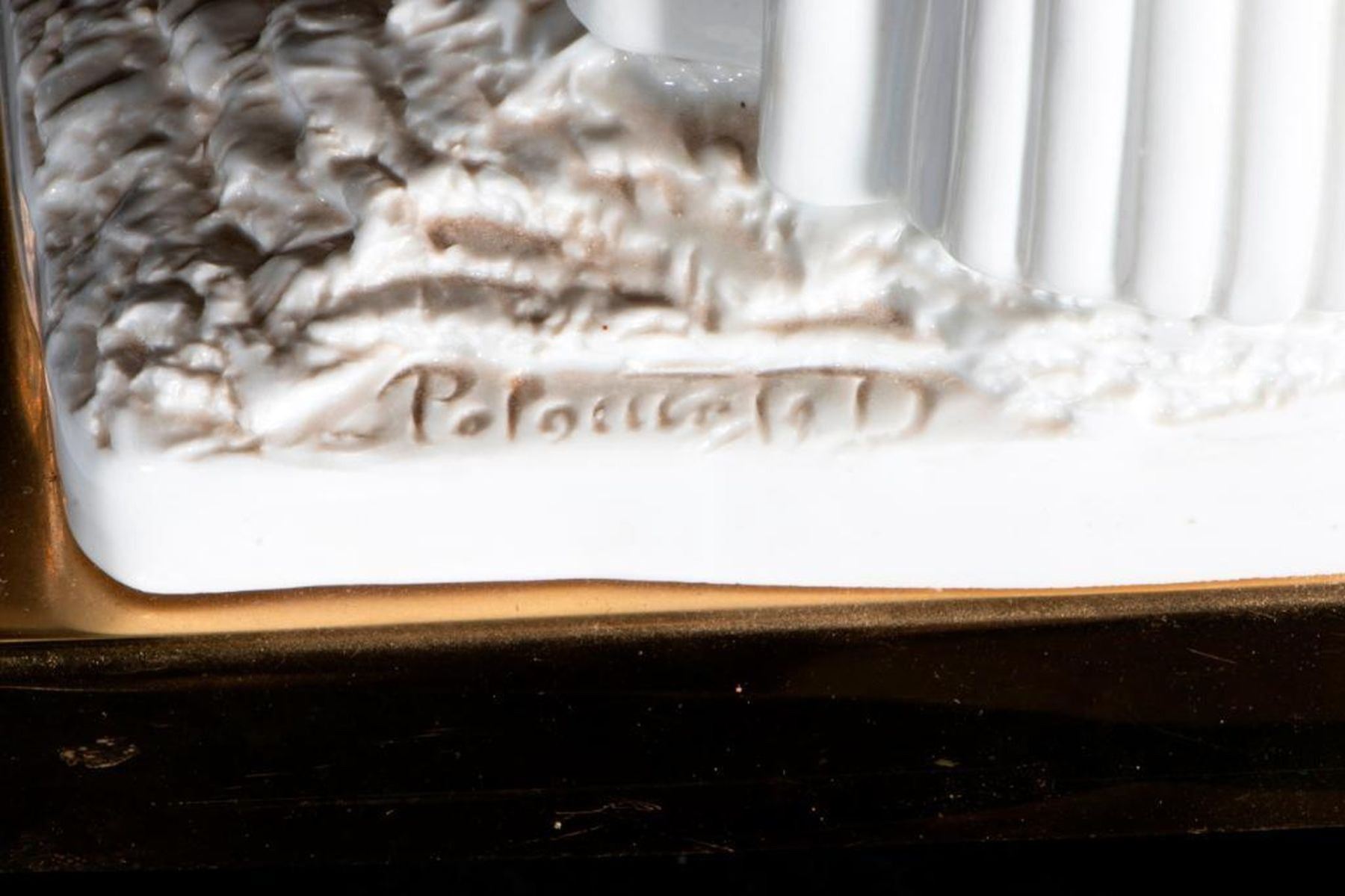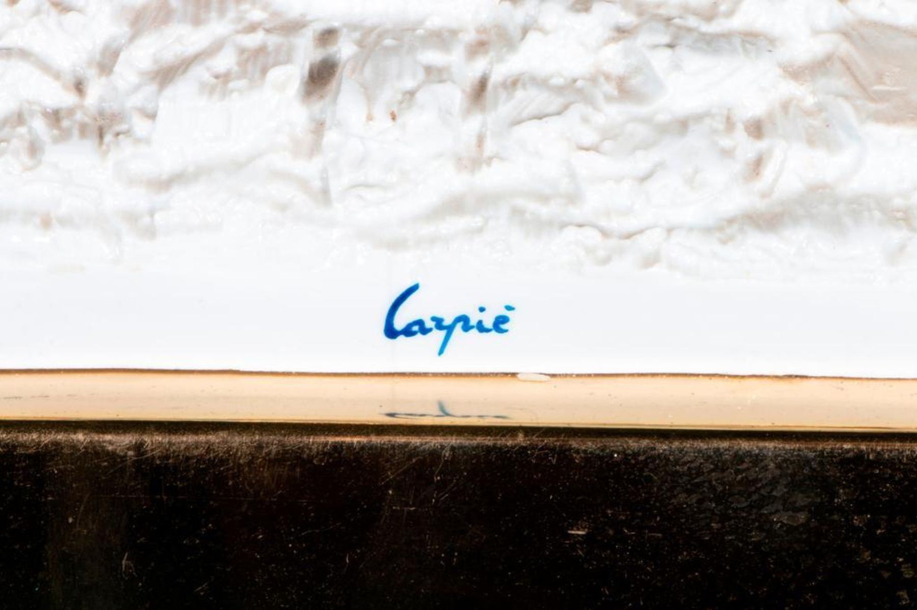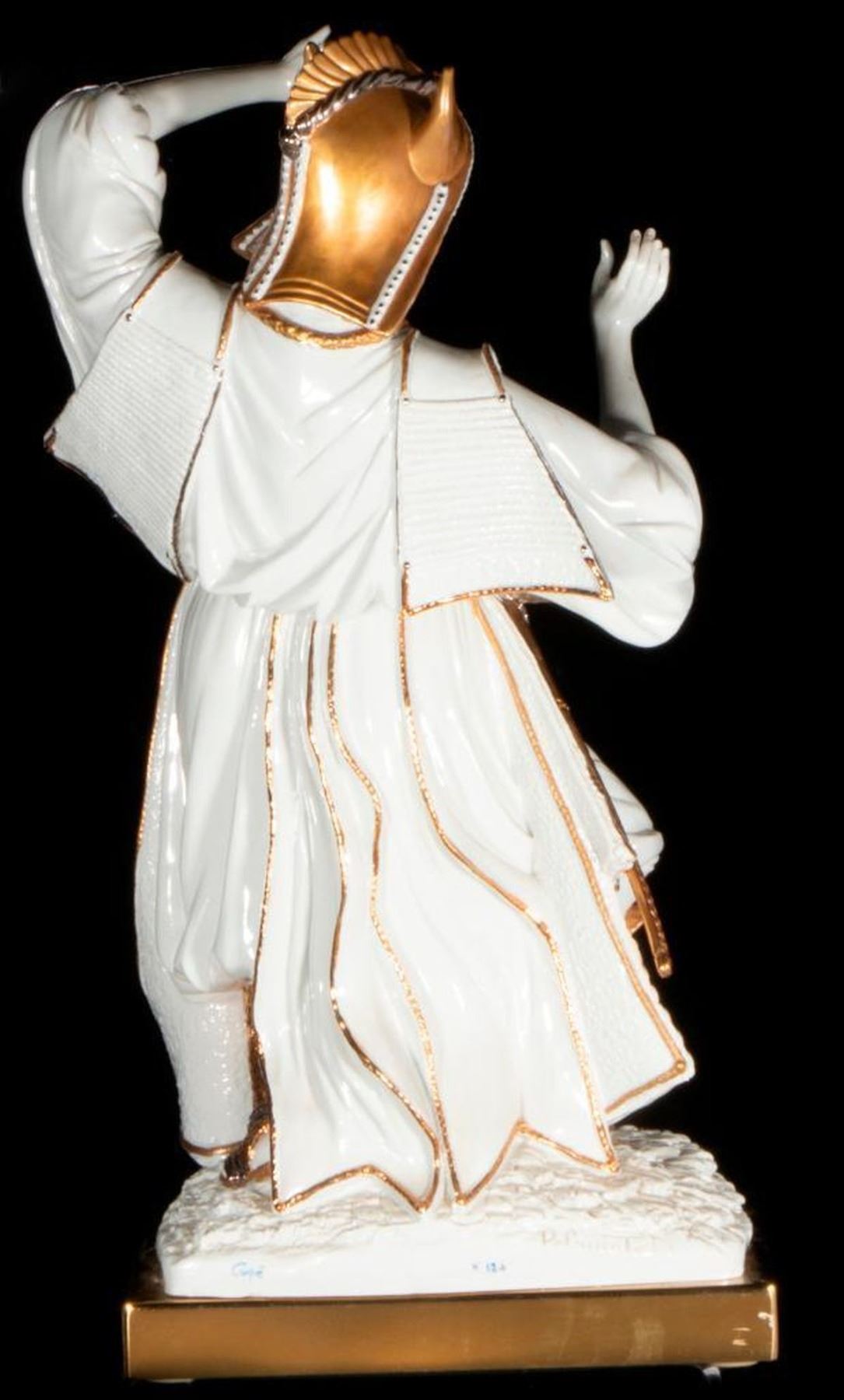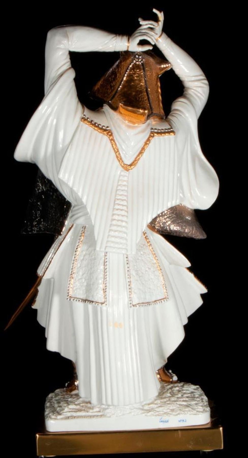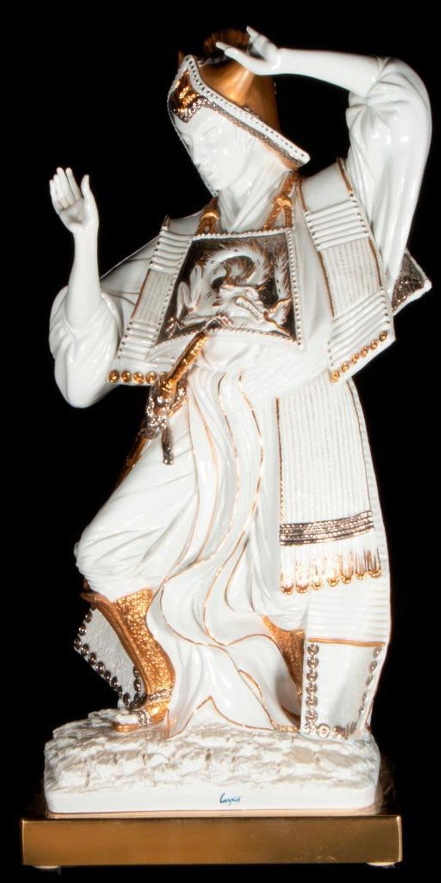 A pair of signed Carpie porcelain dancers measuring 22 inches high x 12 wide x 7 1/4 deep. Some loss to fingers.