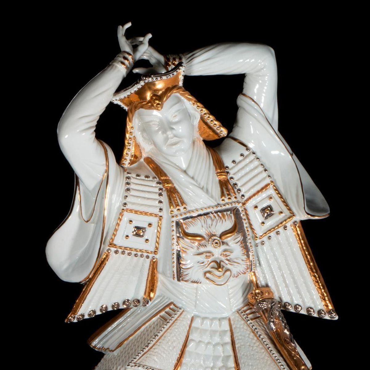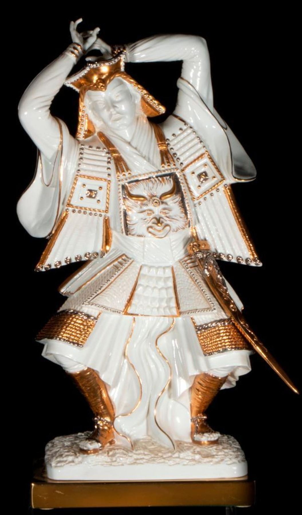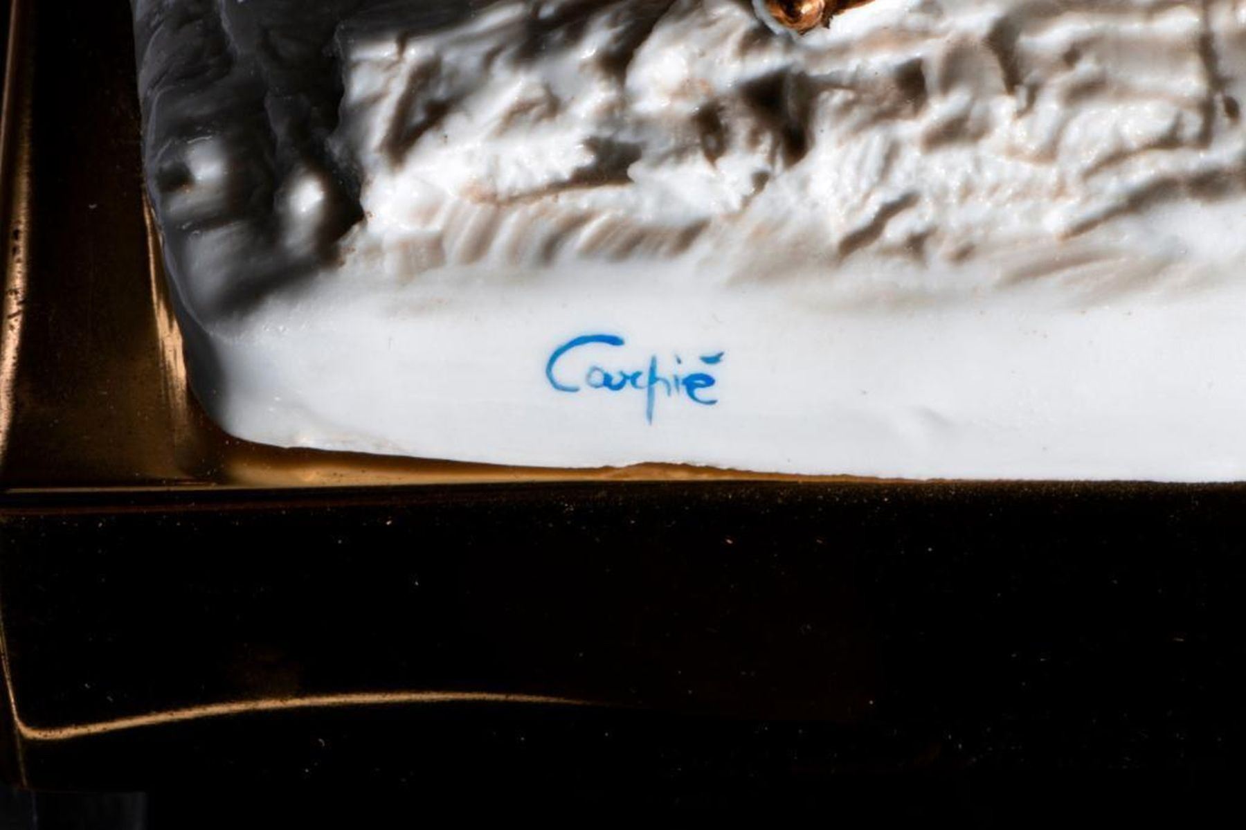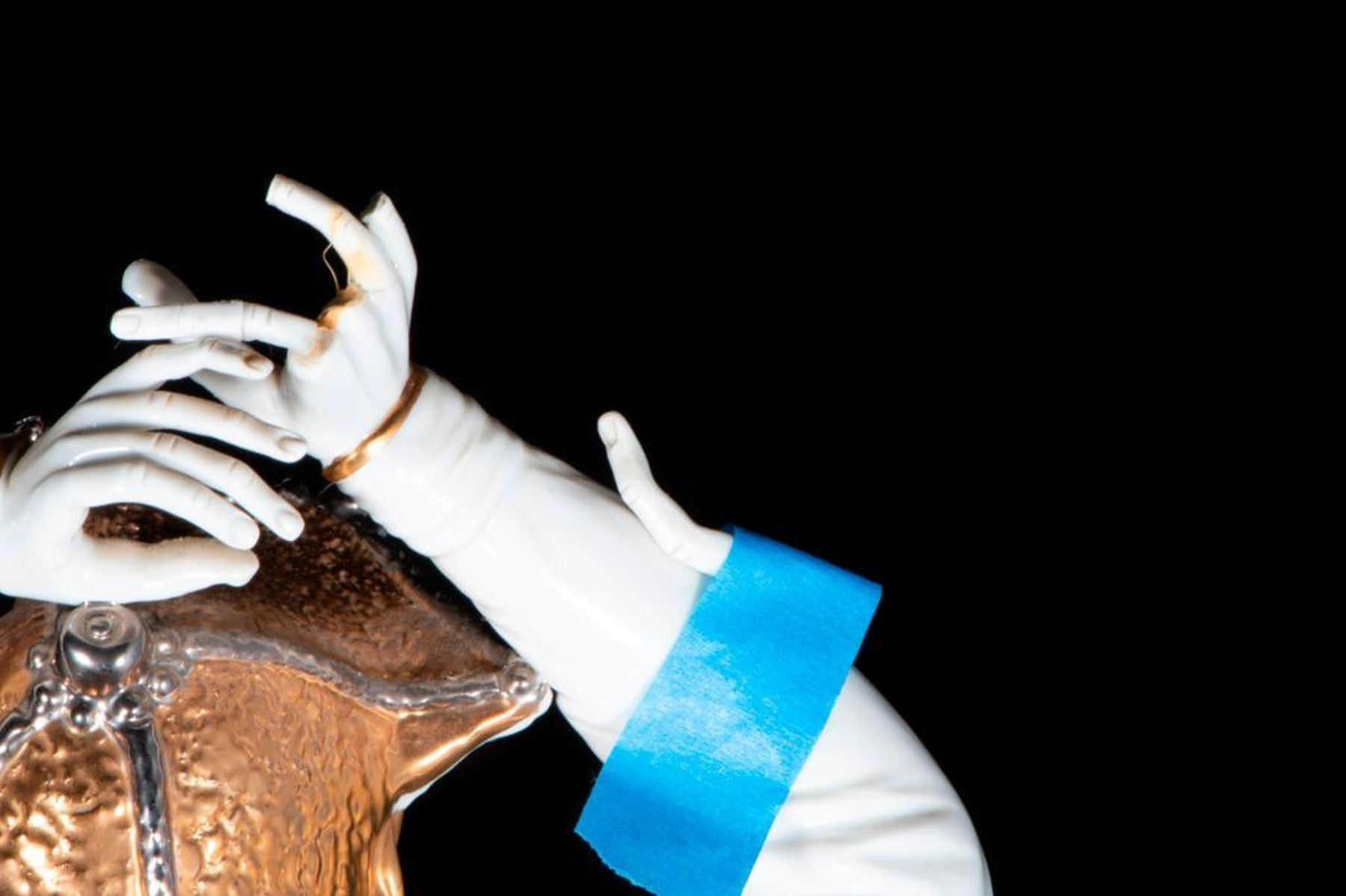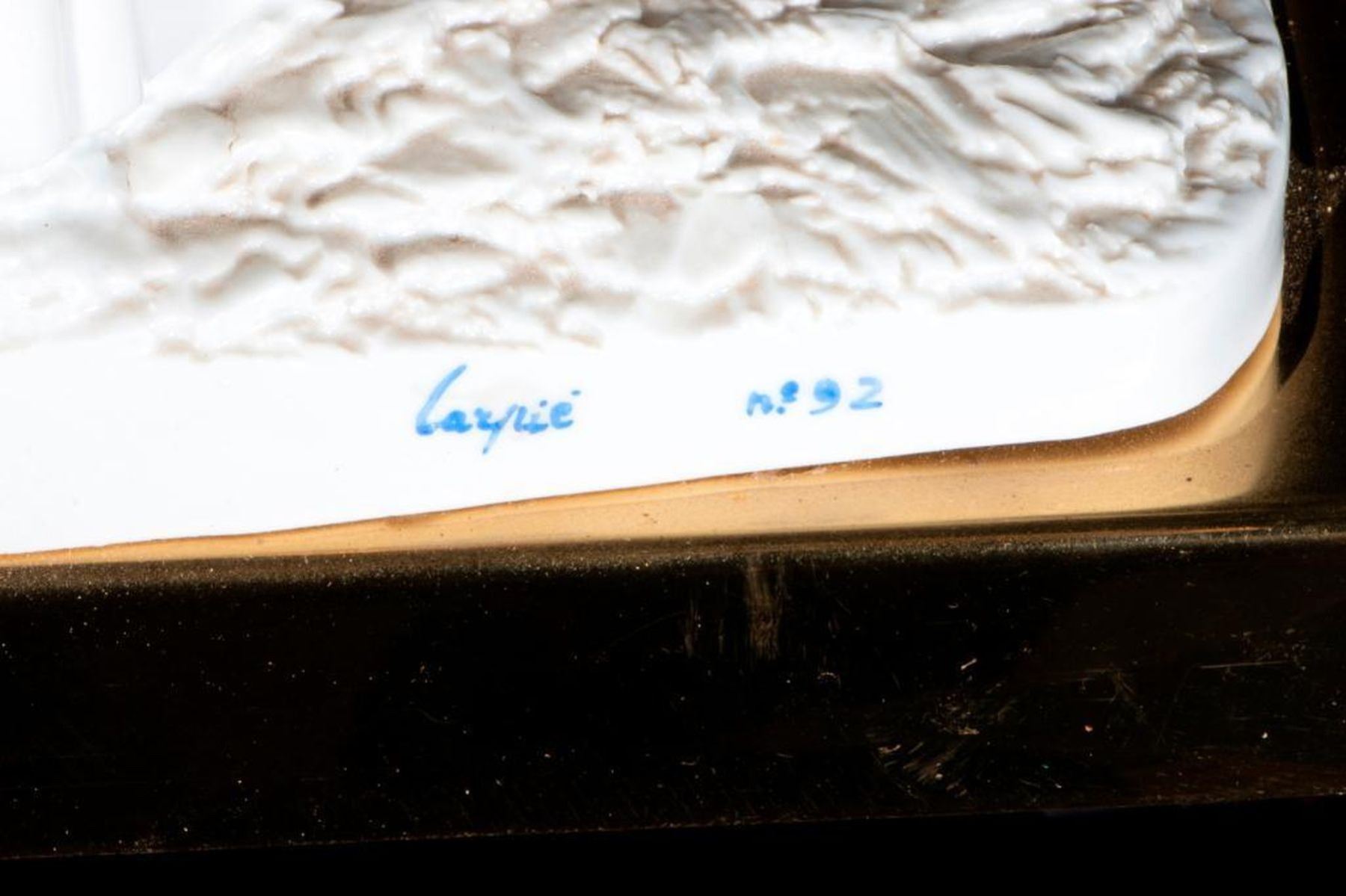 A pair of signed Carpie porcelain dancers measuring 22 inches high x 12 wide x 7 1/4 deep. Some loss to fingers.