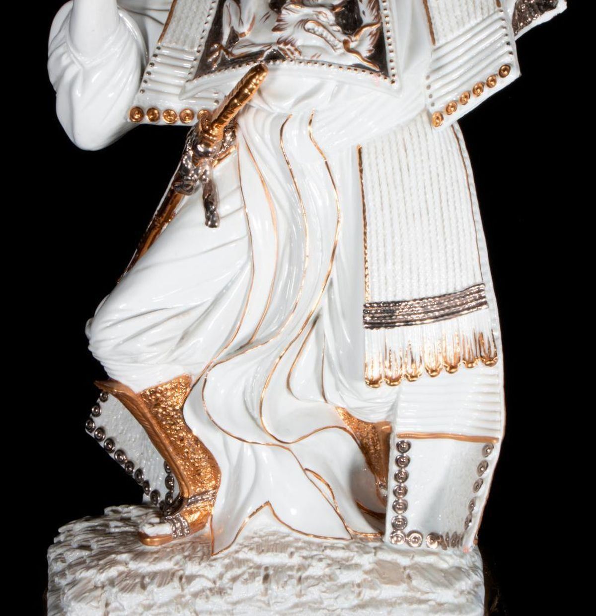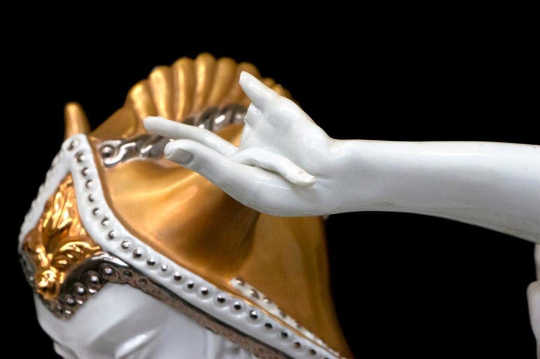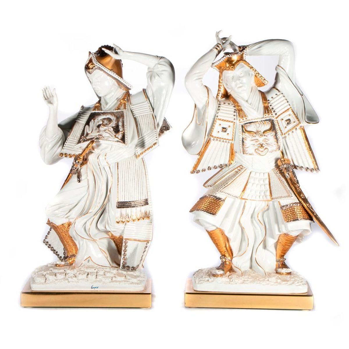 A pair of signed Carpie porcelain dancers measuring 22 inches high x 12 wide x 7 1/4 deep. Some loss to fingers.