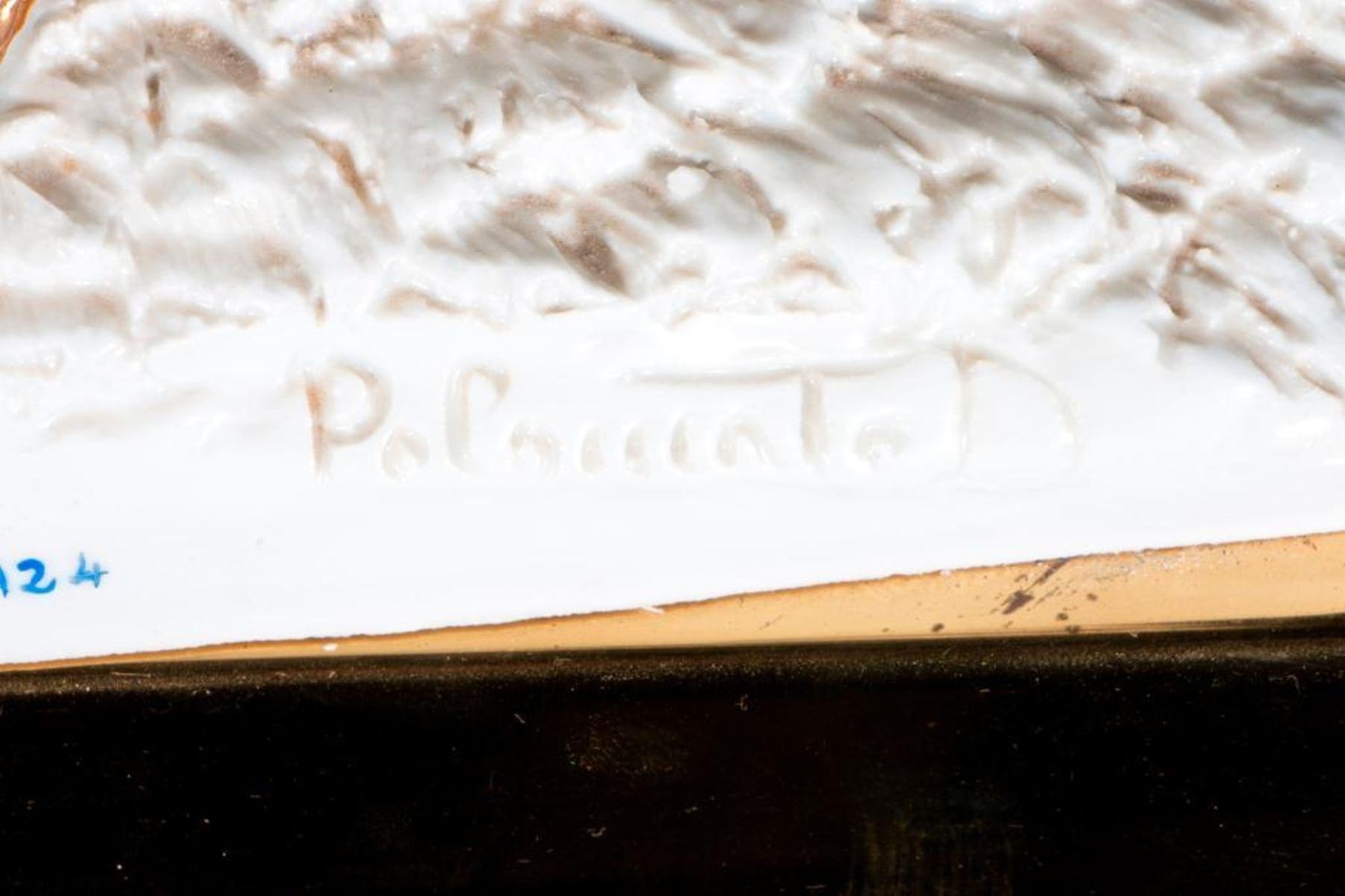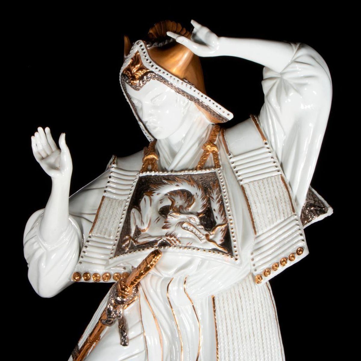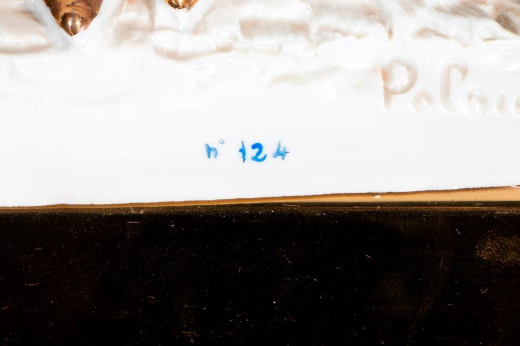 A pair of signed Carpie porcelain dancers measuring 22 inches high x 12 wide x 7 1/4 deep. Some loss to fingers.