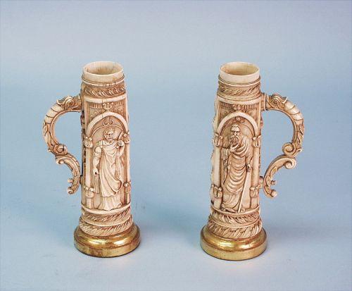 A pair of Central European carved ivory tankards. The columnar vessels finely relief carved with figures, winding serpent handles. Gilt wood stands. Each 7" high. Late 18th, early 19th century.