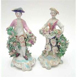 A pair of Chelsea porcelain figures, gentleman with basket of fruit, lady with flowers, on scroll bases, red anchor marks, (damage and restoration) 10.25ins £300-400