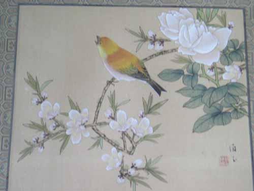 A pair of Chinese watercolours on silk of birds on prunus, and a quantity of embroidered silk panels. £250-350