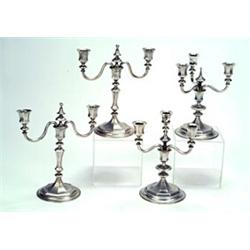 A pair of Continental short three branch candelabra and a pair of matching two branch candelabra, each with monograms and inscriptions dated 1924, and round facetted bases, .830 standard, approx. 23.5cm high (9 in)