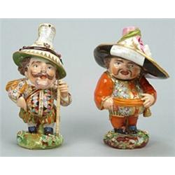 A pair of Derby figures of Mansion House dwarfs, typically modelled and dressed, painted and gilt in a rich palette, on flower-encrusted bases, 18cm high, incised numerals N 227, first quarter 19th century (minor chips and overpainting)