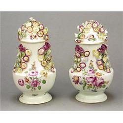 A pair of Derby flower-encrusted baluster pot pourri vases and covers, painted in coloured enamels with bouquets of flowers, 20cm high, circa 1760 (small chips to flowers) (see illustration) £1,000-1,500