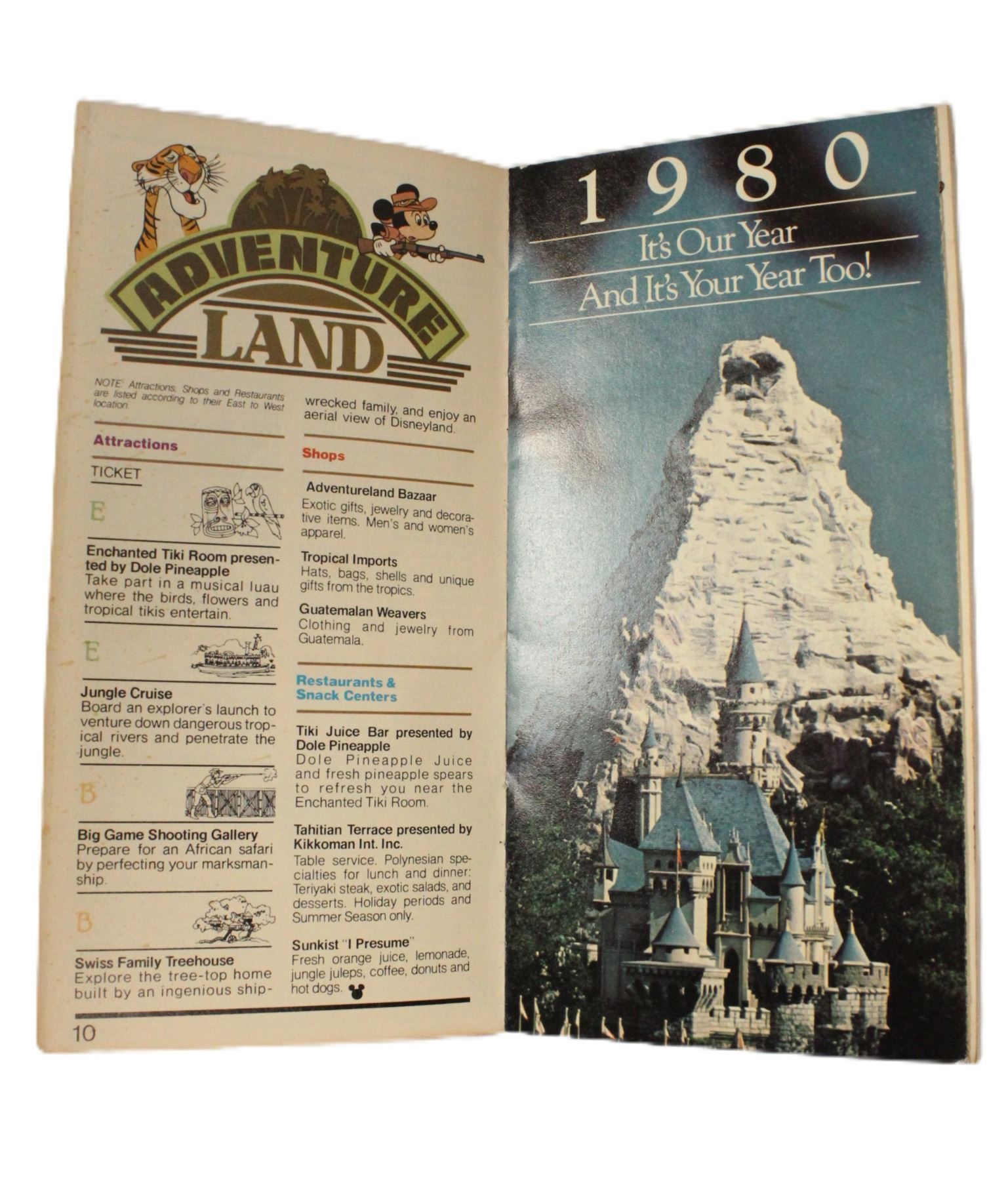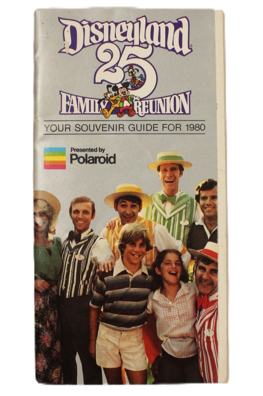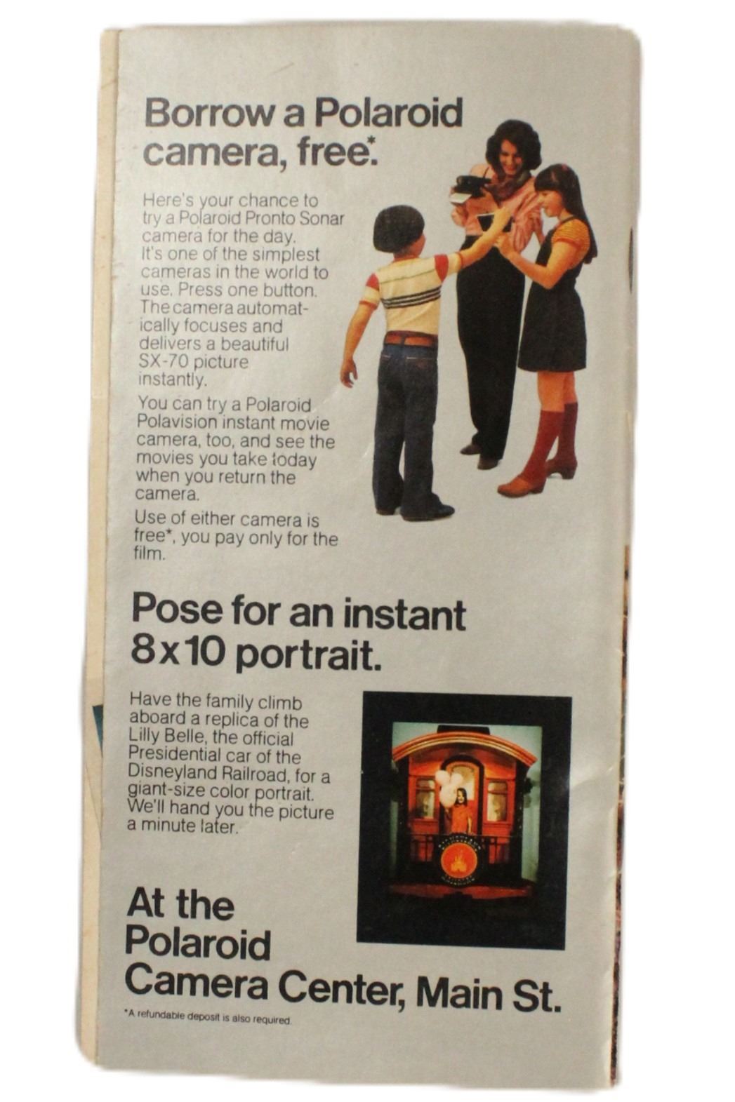 (Disneyland, 1970, 1980) A Disneyland Guide 30-page booklet by INA from 1970 and a 1980 Disneyland 25th Family Reunion guide presented by Polaroid. The 1980 guide is features full color photos, advertises current and upcoming films like The Fox and the Hound and advertises free use of Polaroid cameras while in the park. Information is still included about attraction coupons as 1982 would be the start of the all inclusive passport. The 1970 booklet measures 4" x 6" is in fine condition with some edge wear and two notes written inside the booklet. The 1980 booklet measures 3.75" x 7.5" and is in very fine condition with edge wear and a small chip in the cover.
