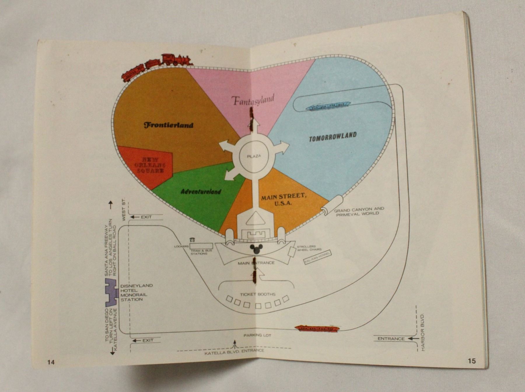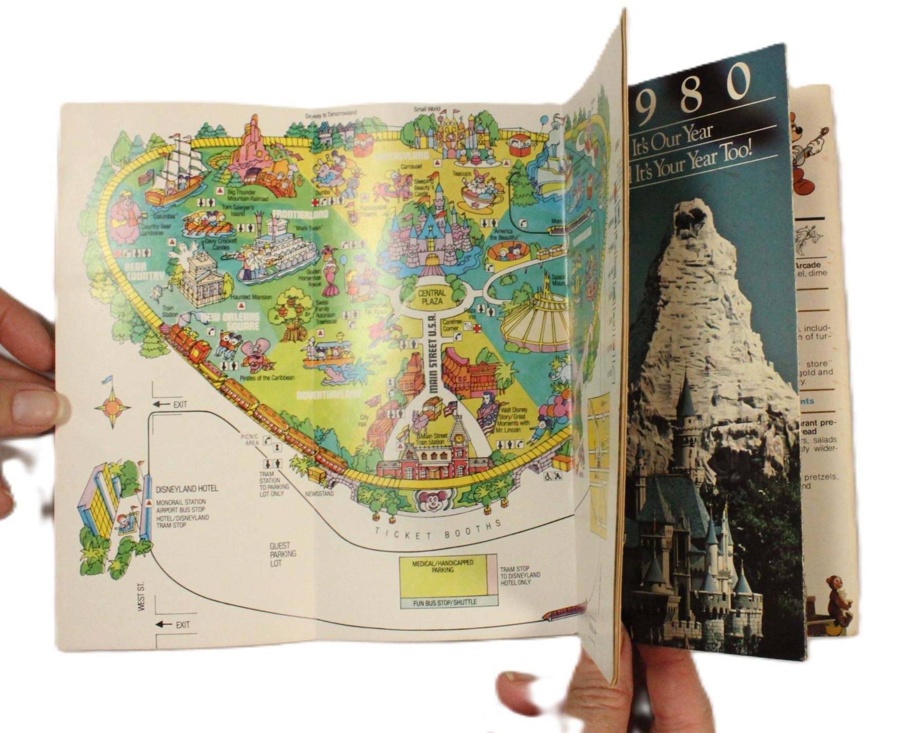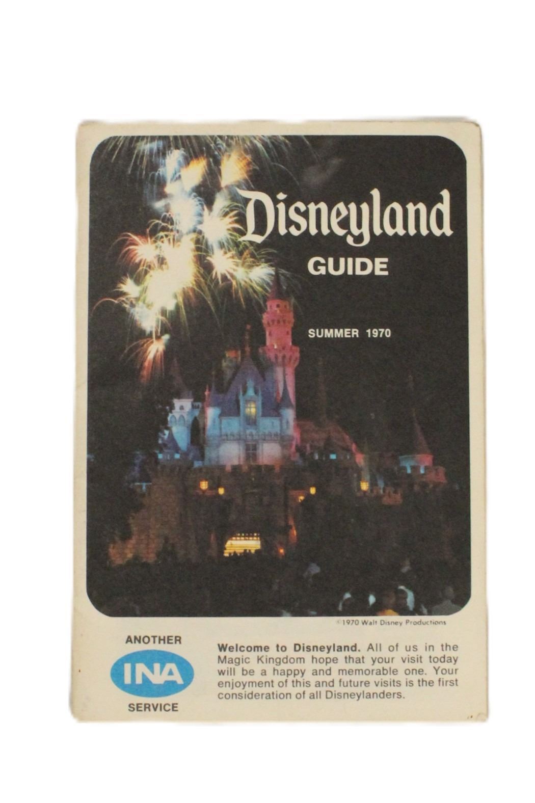 (Disneyland, 1970, 1980) A Disneyland Guide 30-page booklet by INA from 1970 and a 1980 Disneyland 25th Family Reunion guide presented by Polaroid. The 1980 guide is features full color photos, advertises current and upcoming films like The Fox and the Hound and advertises free use of Polaroid cameras while in the park. Information is still included about attraction coupons as 1982 would be the start of the all inclusive passport. The 1970 booklet measures 4" x 6" is in fine condition with some edge wear and two notes written inside the booklet. The 1980 booklet measures 3.75" x 7.5" and is in very fine condition with edge wear and a small chip in the cover.