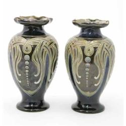 A pair of Doulton Lambeth Frank Butler baluster vases, decorated with stylised scrolling foliage 11ins £1,000-1,500
