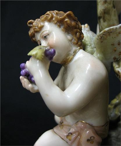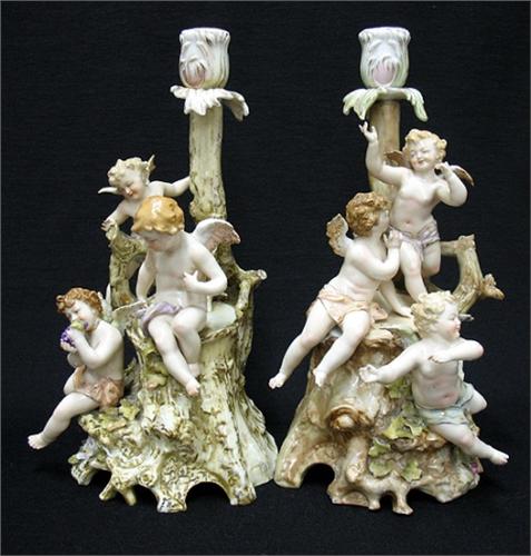A pair of E & A Muller Germany porcelain figural candlesticks; each depicting three winged cherubs on tree stump; 11" high; marked on bottom (see Kovel's New Dictionary of Marks page 113 F) C.1895+ (three cherubs with damage to fingers; one wing with chips; one cherub glued at neck; firing crack on base of one; small chip on base of other; one branch with chip; and one with damage below candleholder)