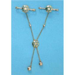A pair of Edwardian gold, pale blue enamel and diamond set lace pins, with uniting trace link chain, having a matching diamond set motif and gold bead drops £150-180