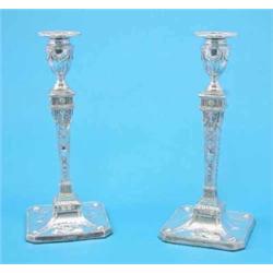 A pair of Edwardian silver Adam style candlesticks, with classical motif decoration and square feet, Sheffield 1904, 12ins. £1,000-1,500