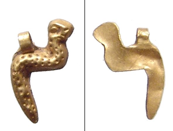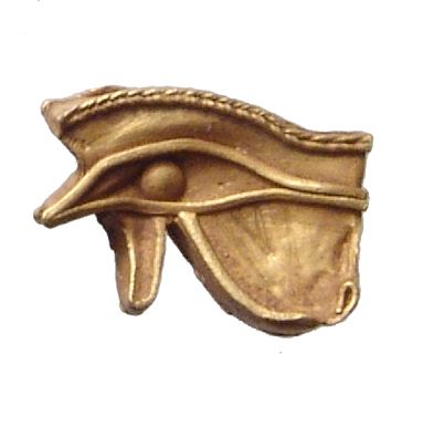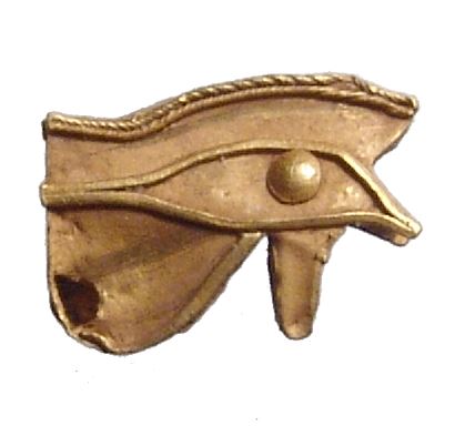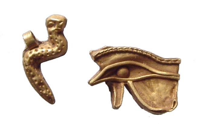 A pair of Egyptian gold amulets, Late Period, c. 664 - 30 BC, the first an incredible Eye of Horus amulet hollow and formed from sheet gold, doubled sided with great detail, (1.5 x 1 cm, 0.86g), holed lengthwise for suspension. The second is a gold amulet of a Uraeus or cobra, with nice detail and looped for suspension, (1.4 x 1.2 cm, 0.32g). Both are very nice examples in good quality gold. Ex Philadelphia private collection.