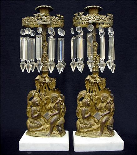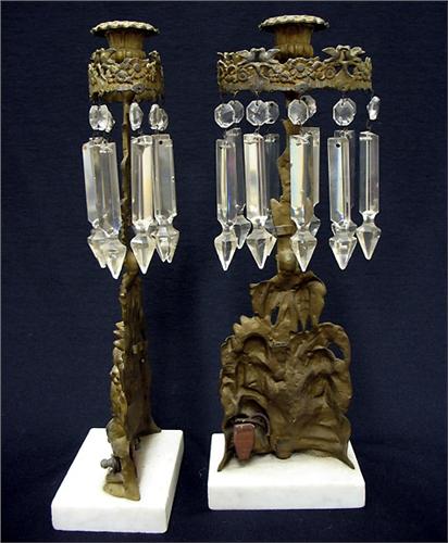 A pair of Empire brass girandoles on marble bases; each with tooled single candle socket over oval banding with tooled lovebird design hung with prisms; standard terminates in pair of seated figures under palm tree; on rectangular marble base; 19th C.; 15" high x 5" x 4" (no visible defects)