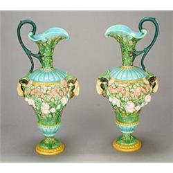 A pair of English majolica ewers, possibly George Jones, the flared necks with scroll handles abo...