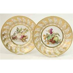 A pair of English porcelain dessert plates, circa 1800, the centres painted with a miscellany of fruit on marble slabs, within a broad gilded border of oak leaves, 8.5in. £100-150
