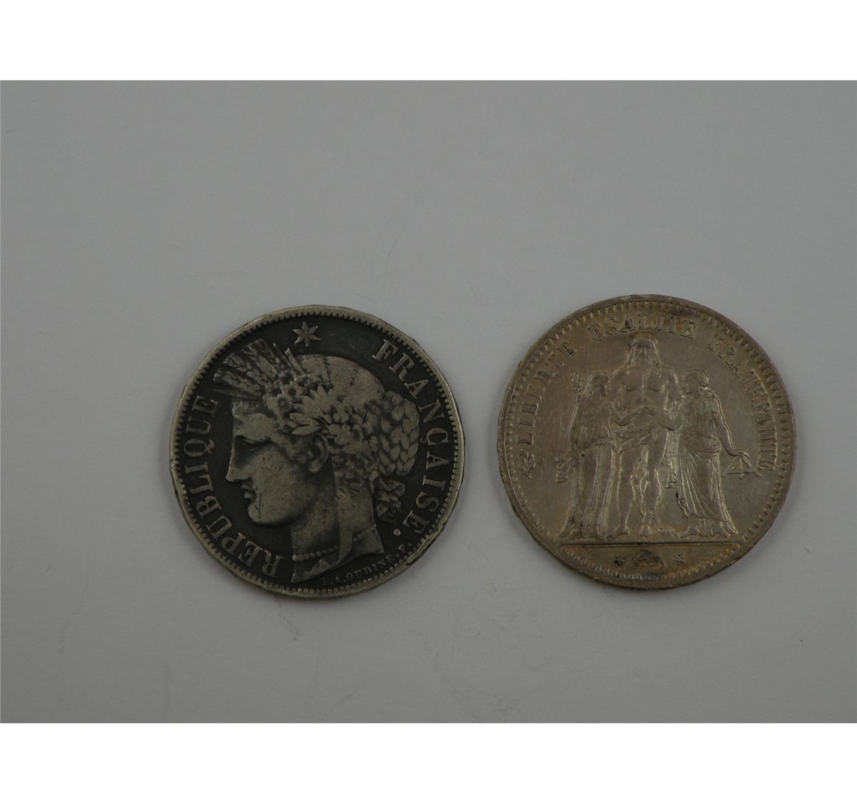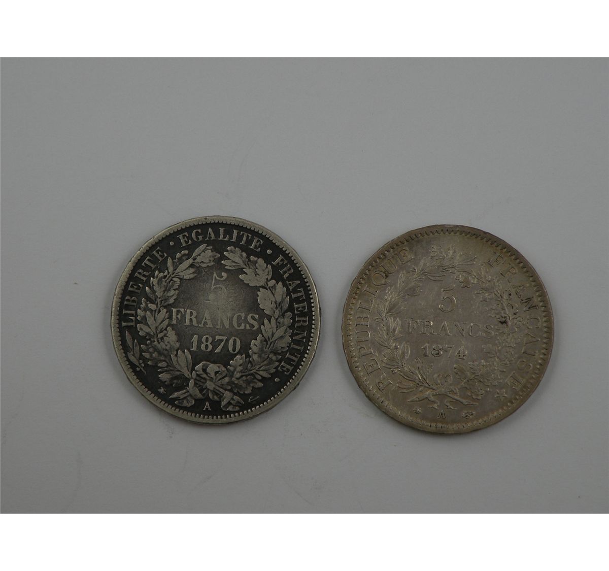 A pair of France 5 Franc silver crowns: 1870- A Fine, minor rim bumps. Scarce one year reverse type; 1874-A EF or better, faint obverse field scratch. A total of 2 coins. Est.$100