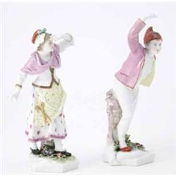 A pair of Frankenthal figures of a peasant boy and girl, he wearing red cap, puce lemon-lined jacket and white breeches, she with a puce shawl, lemon apron with gilt and puce floret painted skirt, a pair of scissors hanging to one side, each standing with outspread arms, she shading her eyes, 6.25ins. high, blue underglaze mark. Provenance Edgar Horn, Eastbourne 20th December 1977 £300-500