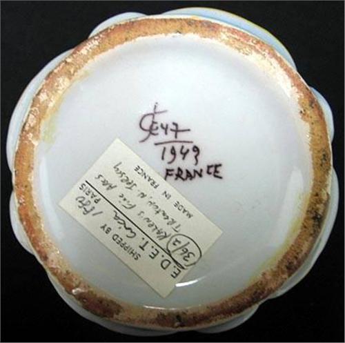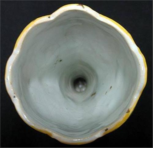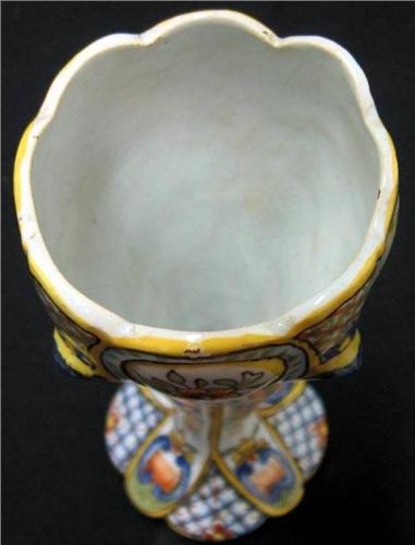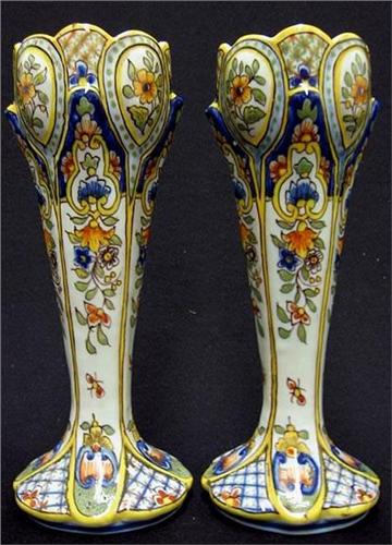 A pair of French faience vases; scalloped rim; tapered form terminating in flared base; polychrome hand painted decoration on white ground; marked on bottom; early 20th C. each measures 9 1/4" high x 3 1/4" diameter (a few small glaze chips on base)