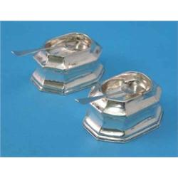 A pair of George I silver trencher salts, of canted rectangular form, London 1725, marks rubbed, with two shovel shape salt spoons £300-400