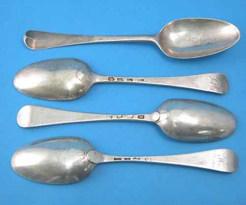 A pair of George II Old English Pattern silver table spoons, maker HS London 1746 and two similar George II spoons £80-120