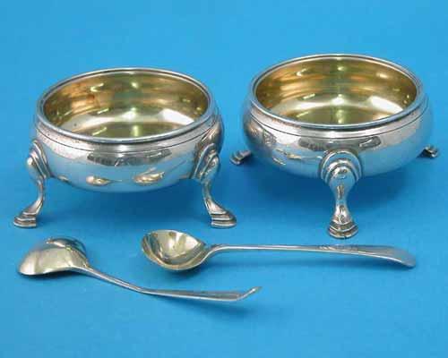A pair of George III silver bun salts, on scroll feet, London 1772, and a pair of later spoons with gilt bowls, 1806 £80-120