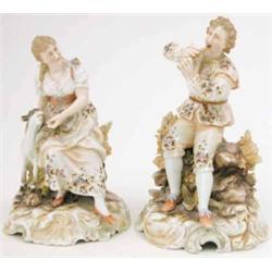 A pair of German porcelain figures, shepherd playing pipe, shepherdess seated beside lamb, some damage, 7in. £80-120