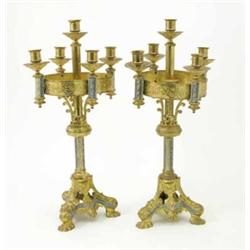 A pair of Gothic style gilt metal five branch table candelabrum, the knopped stem supported on triform base with cast foliate decoration throughout and blue painted highlights, 19 ins £100-150