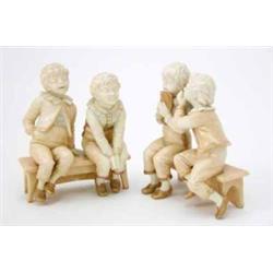 A pair of Hadley Worcester figure groups, schoolboys seated on benches, verses by Goldsmith printed beneath in gilt, designs registered circa 1888, one group repaired, 4.25in. £400-600
